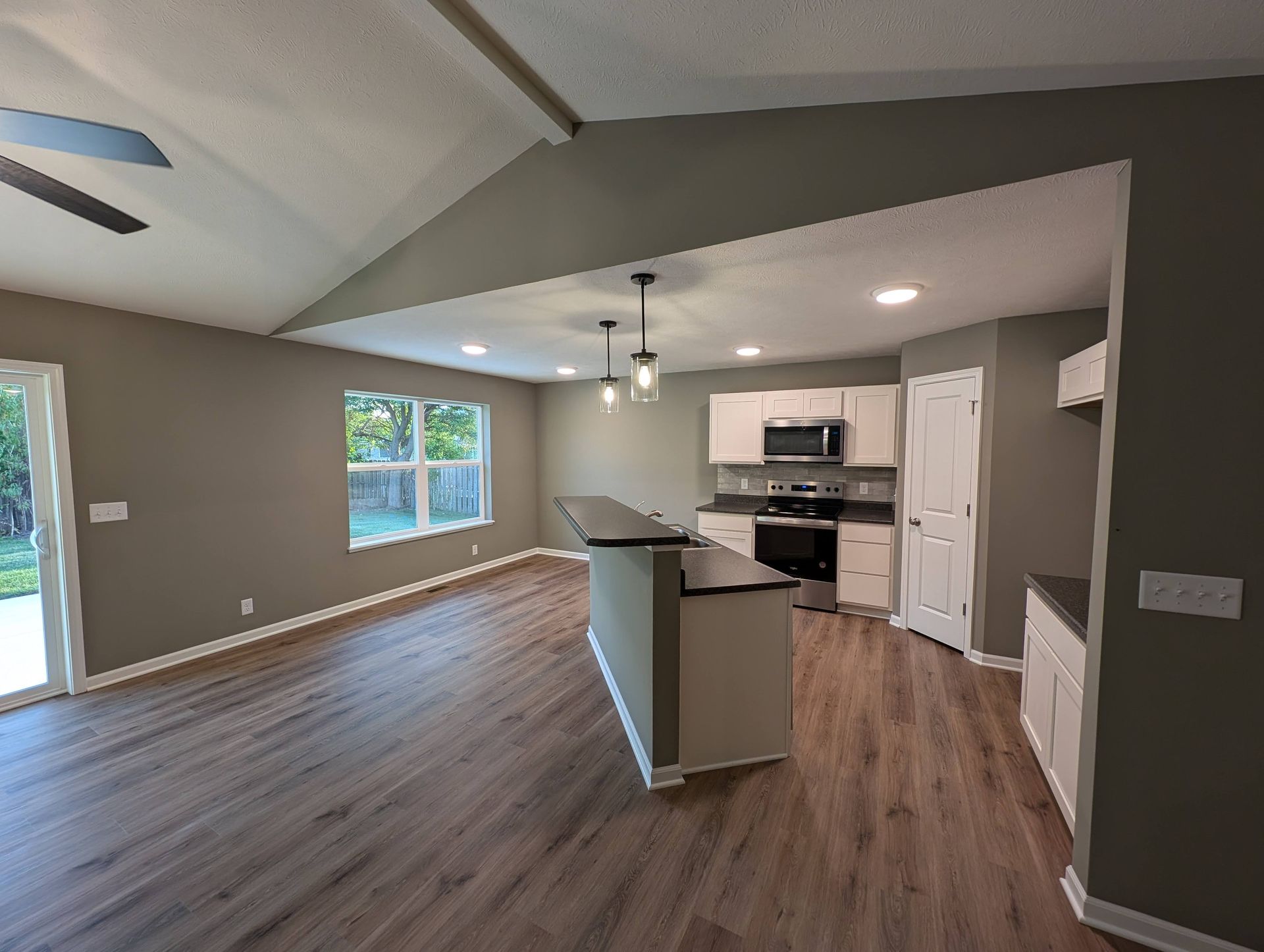 - The main living space separates the primary bedroom from bedroom #2 and hall bathroom
