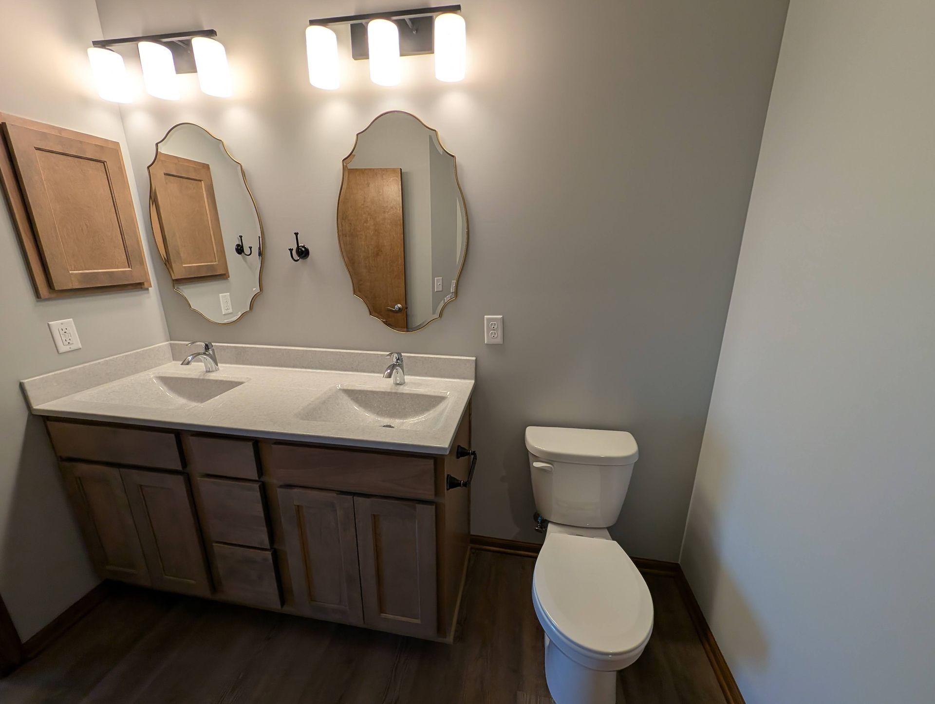 - Double primary bath vanities and linen cabinet