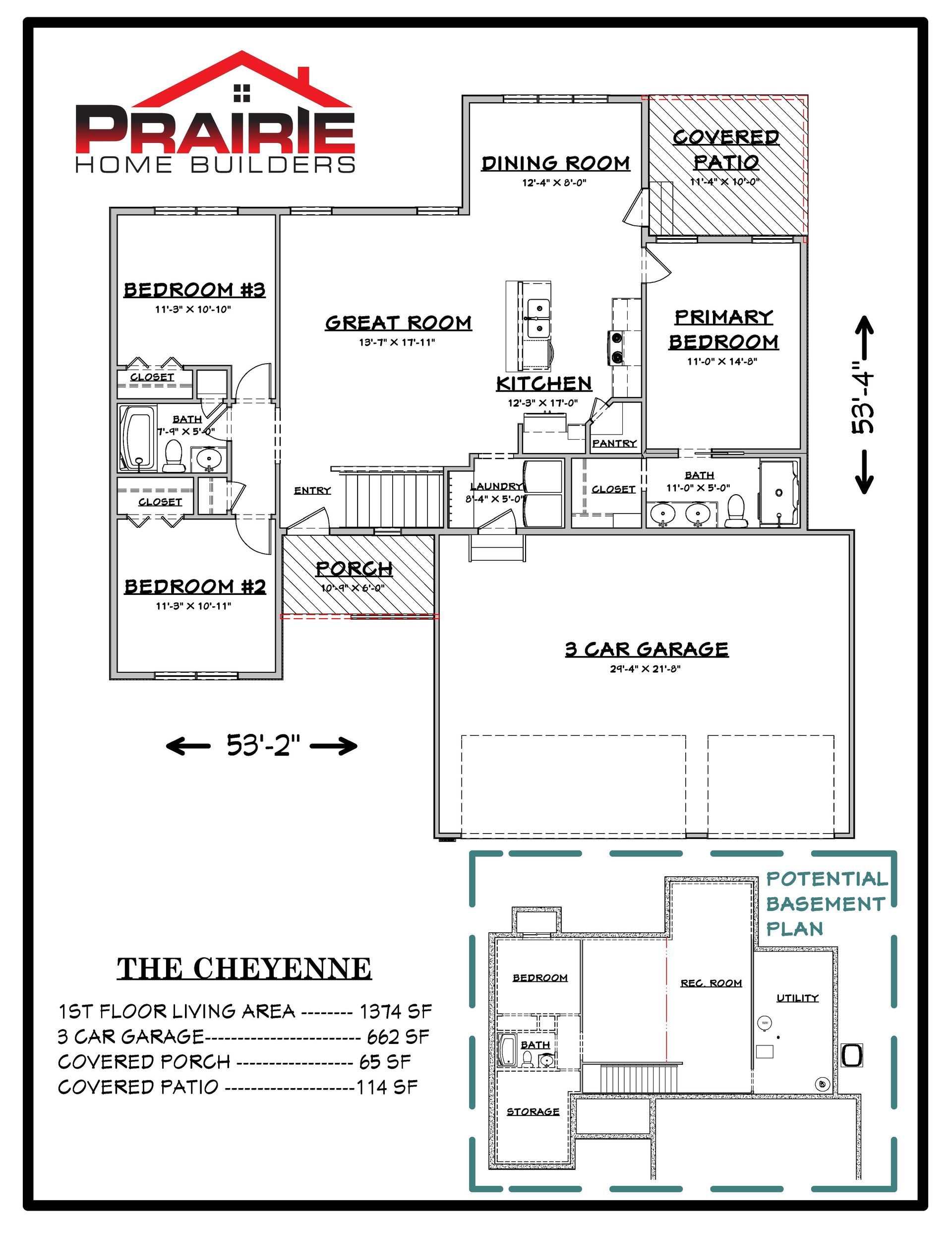 The Cheyenne is a welcoming split ranch, perfect for wider lots, with 1,374 square feet of thoughtfully designed first-floor living. This 3-bedroom, 2-bath home features an open-concept layout, a mudroom off the garage, and a covered patio for outdoor enjoyment. A smaller version of our popular Sierra series, the Cheyenne also offers options for a finished basement and customizable layout to suit your lifestyle.